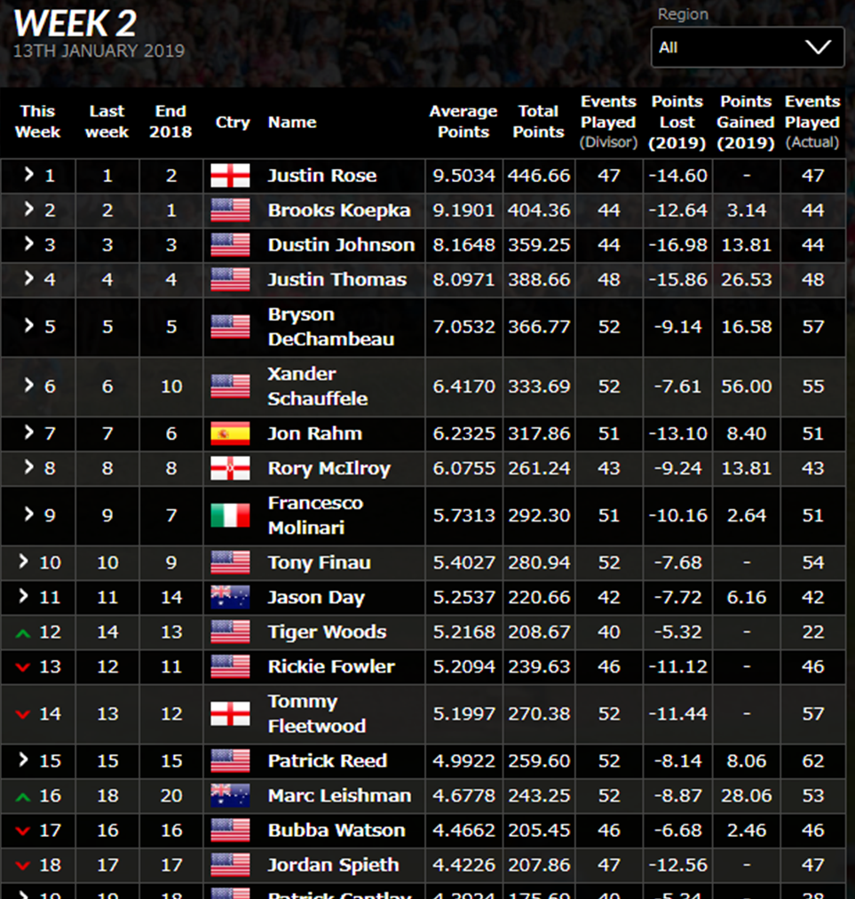 松山英樹の最新ランキング(2019/1/14現在)