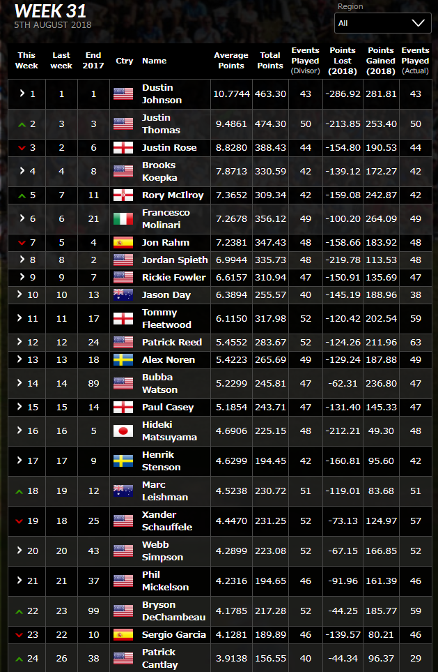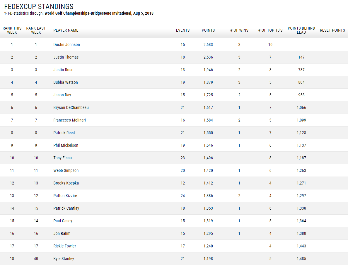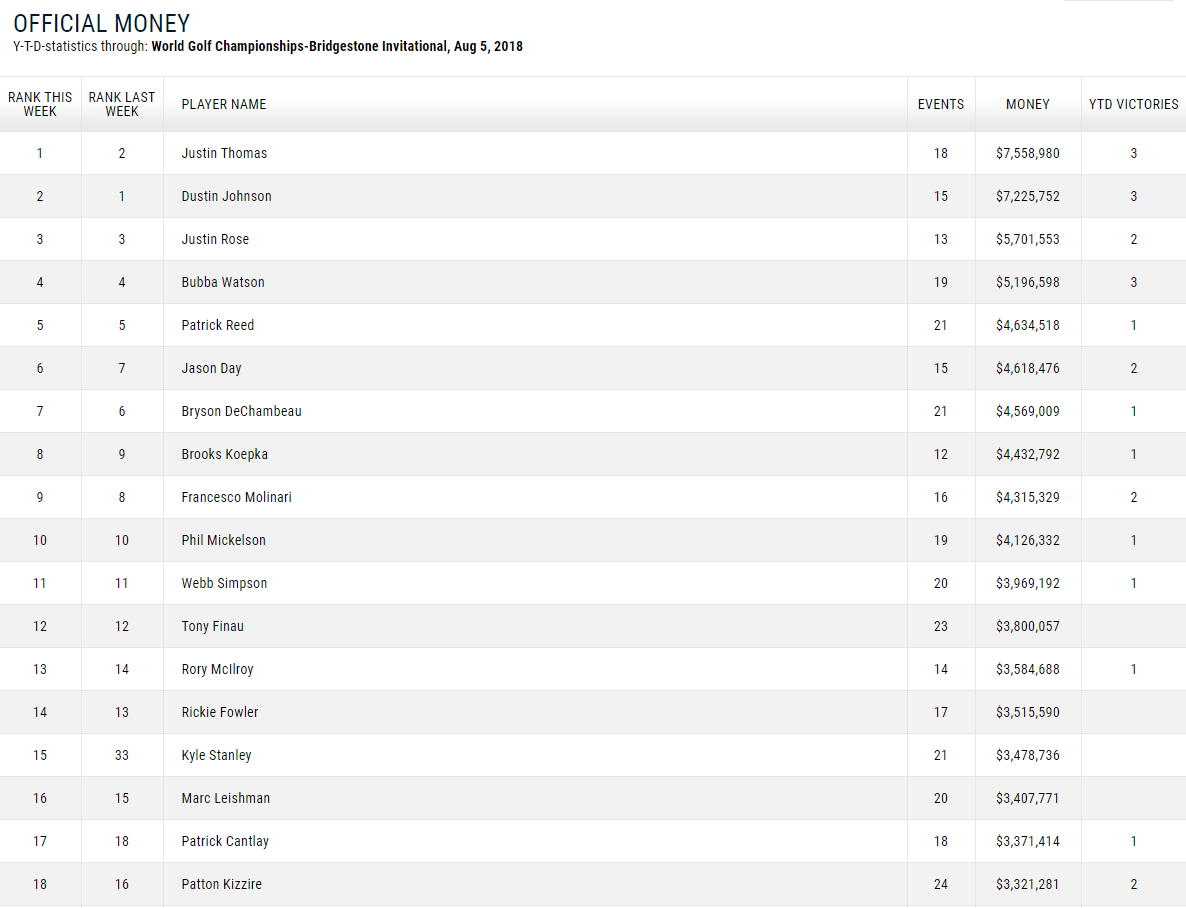 最新の2017-2018年度のFEDEX(フェデックス)ランキングが更新されました。松山英樹選手は先週の86位から87位にランクダウン。