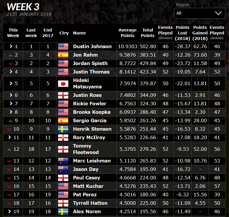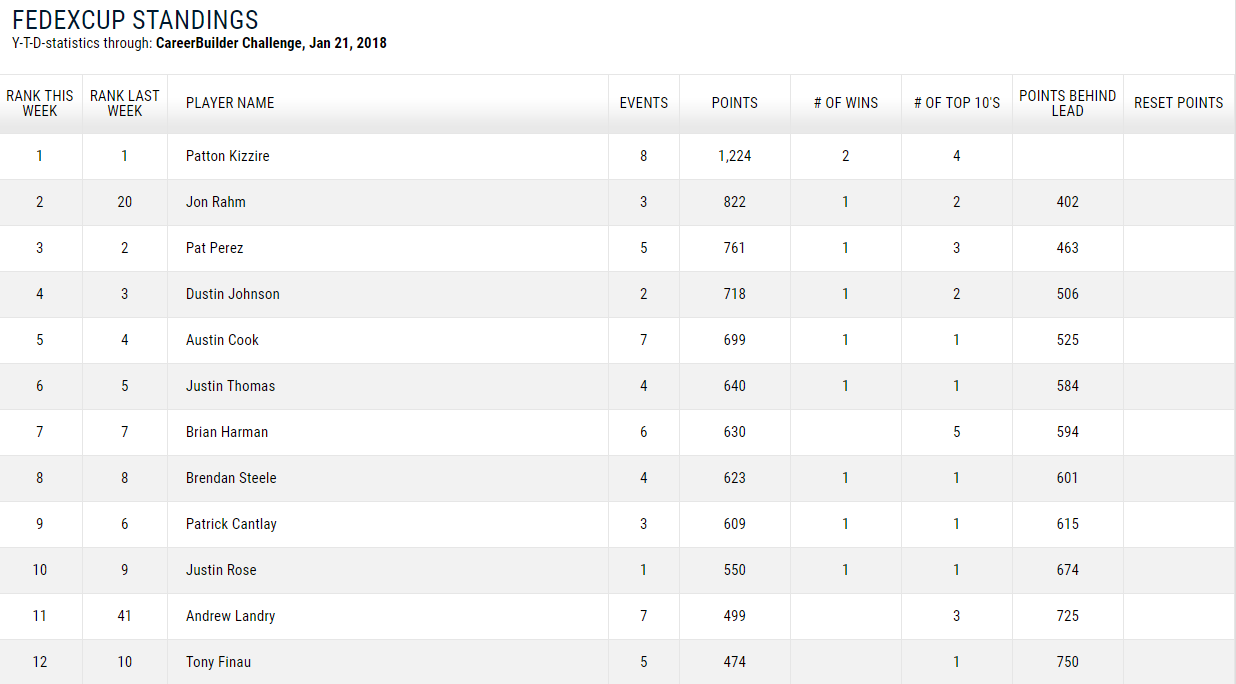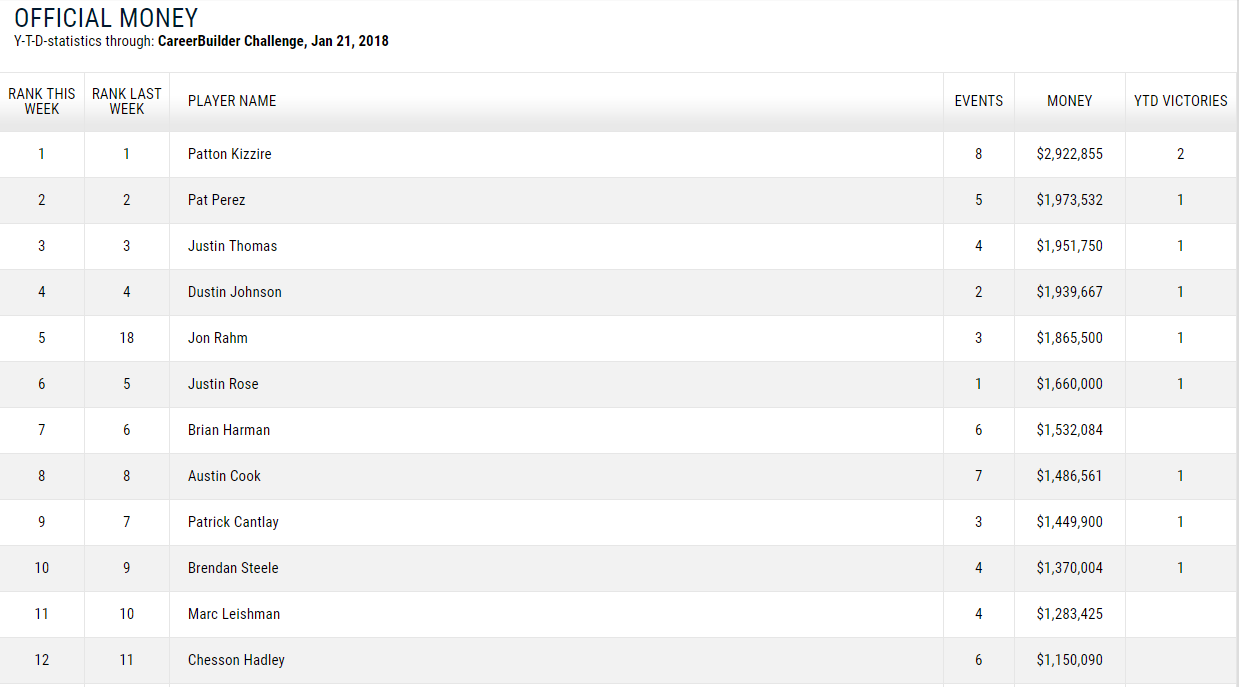 フェデックスランキング(2018/1/22現在)